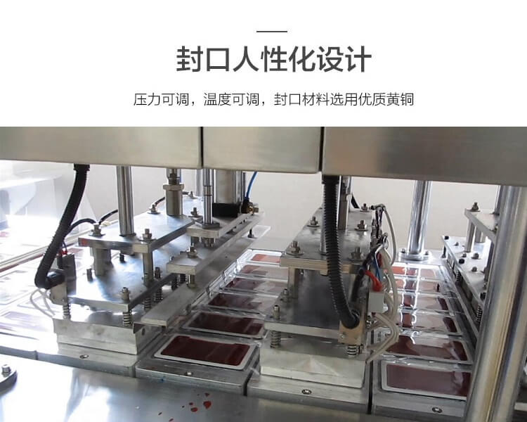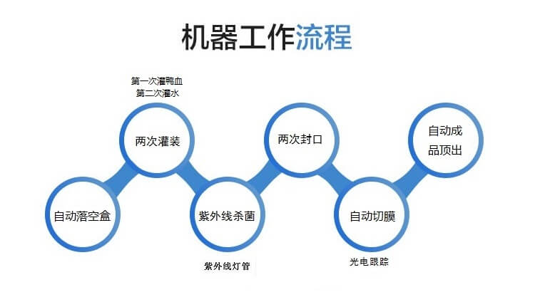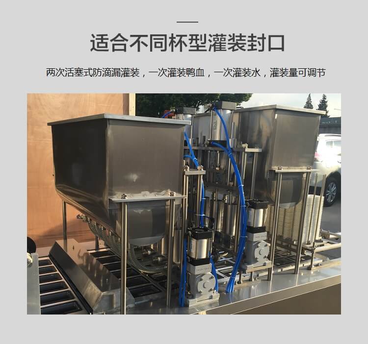 BHJ-6 全自動鴨血灌裝封口機,兩次活塞式防滴漏灌裝,一次灌裝鴨血,一次灌裝水,灌裝量可調(diào)節(jié)。
