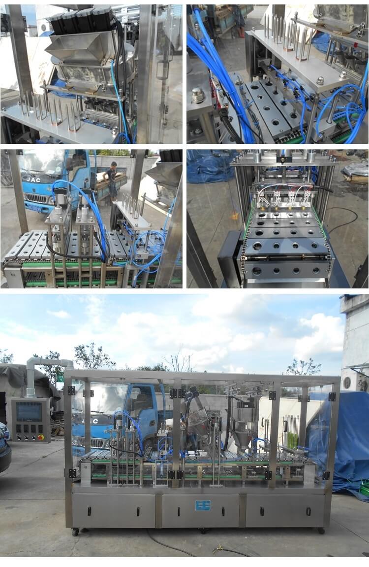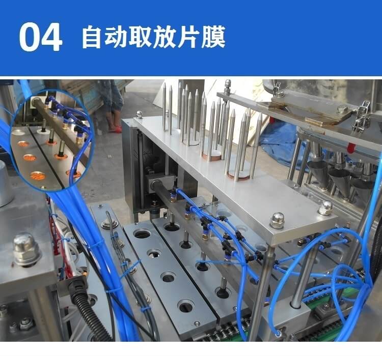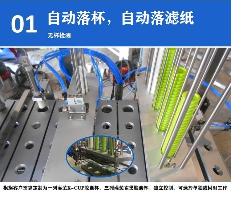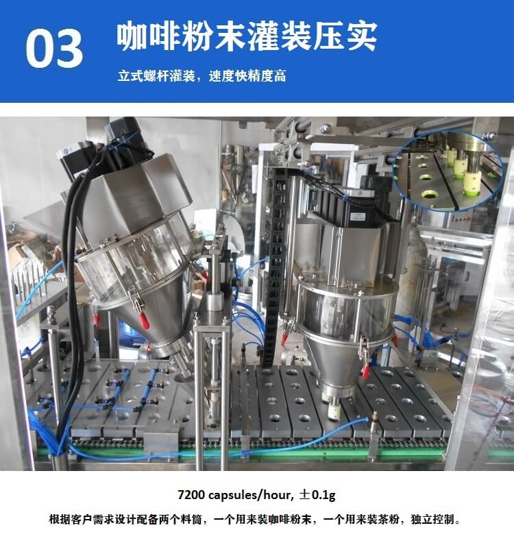 KFP-4 全自動咖啡膠囊灌裝封口機,根據客戶需求,特別設計為一列灌裝K-CUP膠囊三列灌裝Nespresso膠囊,獨立控制,7200 capsules/hour。