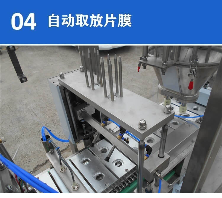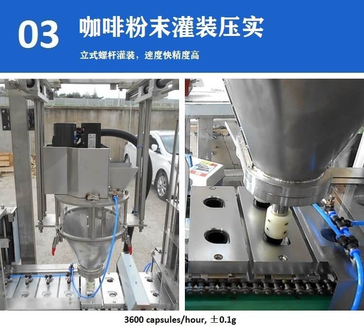 KFP-2 全自動雀巢咖啡膠囊灌裝封口機(jī),特別設(shè)計(jì)為倒扣出杯并連接輸送帶,3600 capsules/hour。